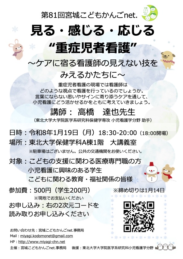 第79回宮城こどもかんごnet.のテーマは「 見る・感じる・応じる“重症児者看護”〜ケアに宿る看護師の見えない技をみえるかたちに〜」です。